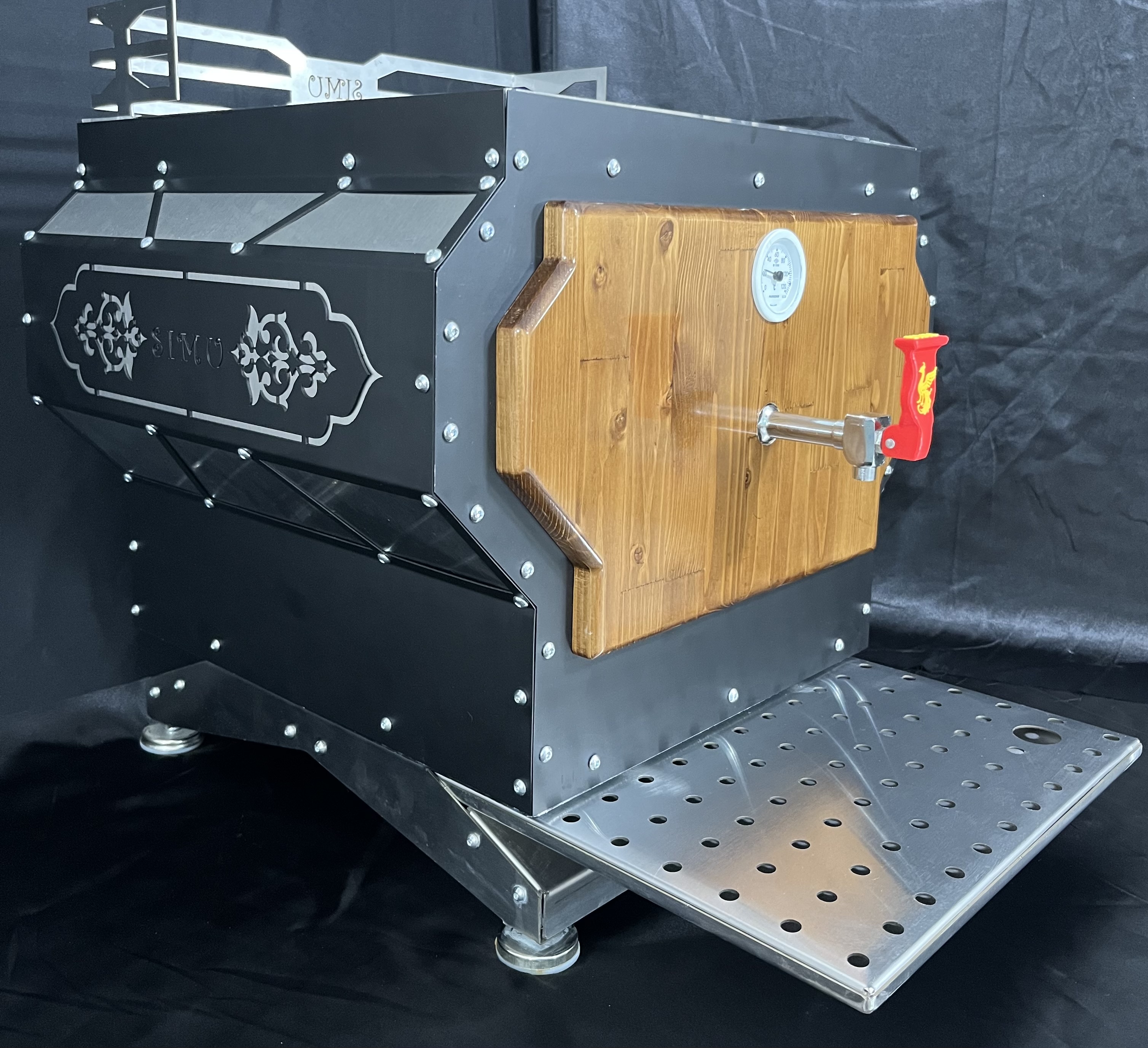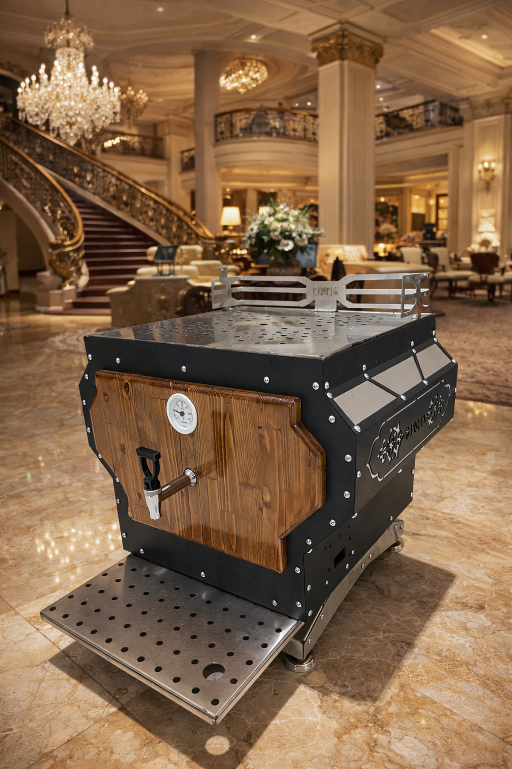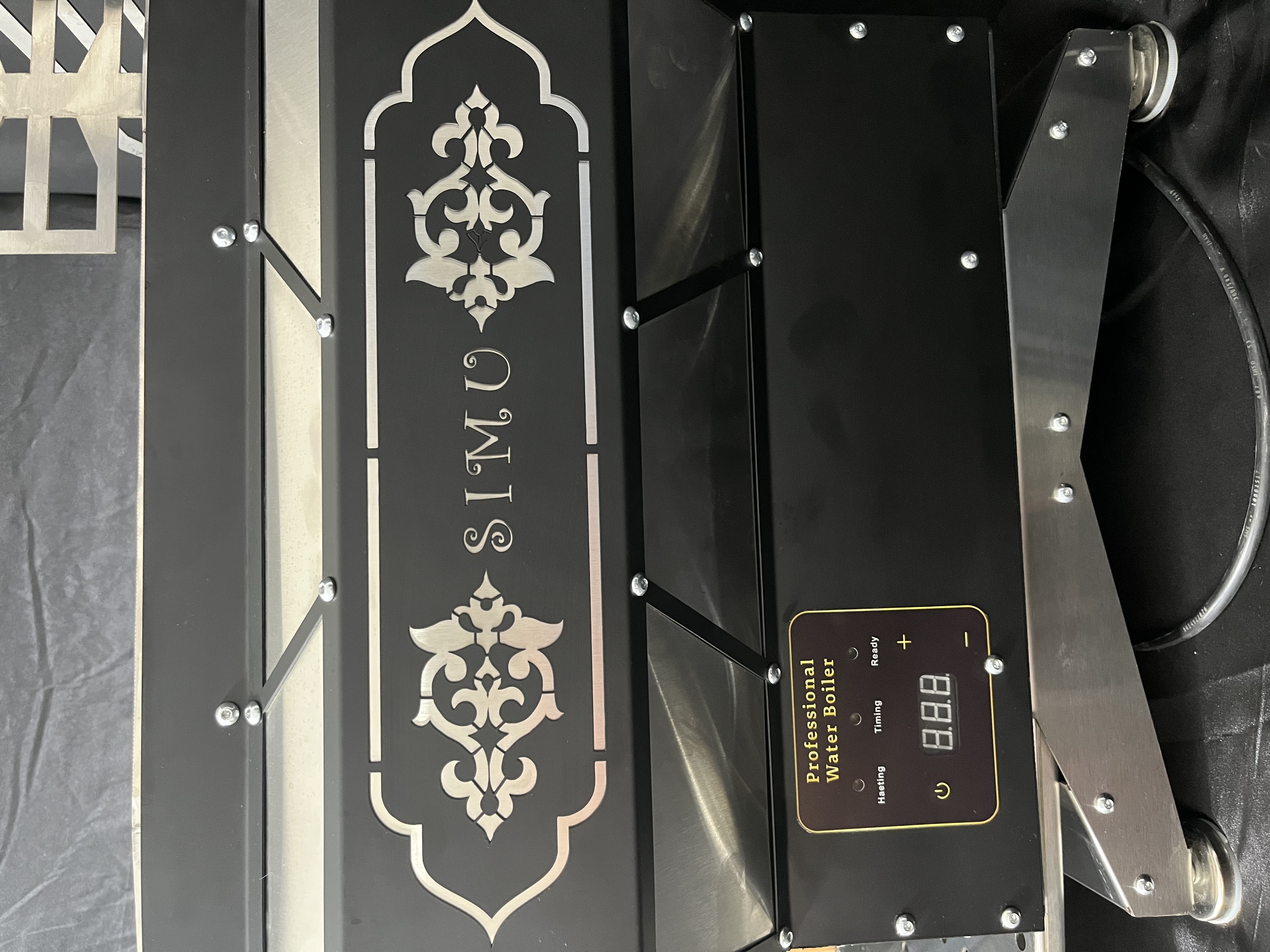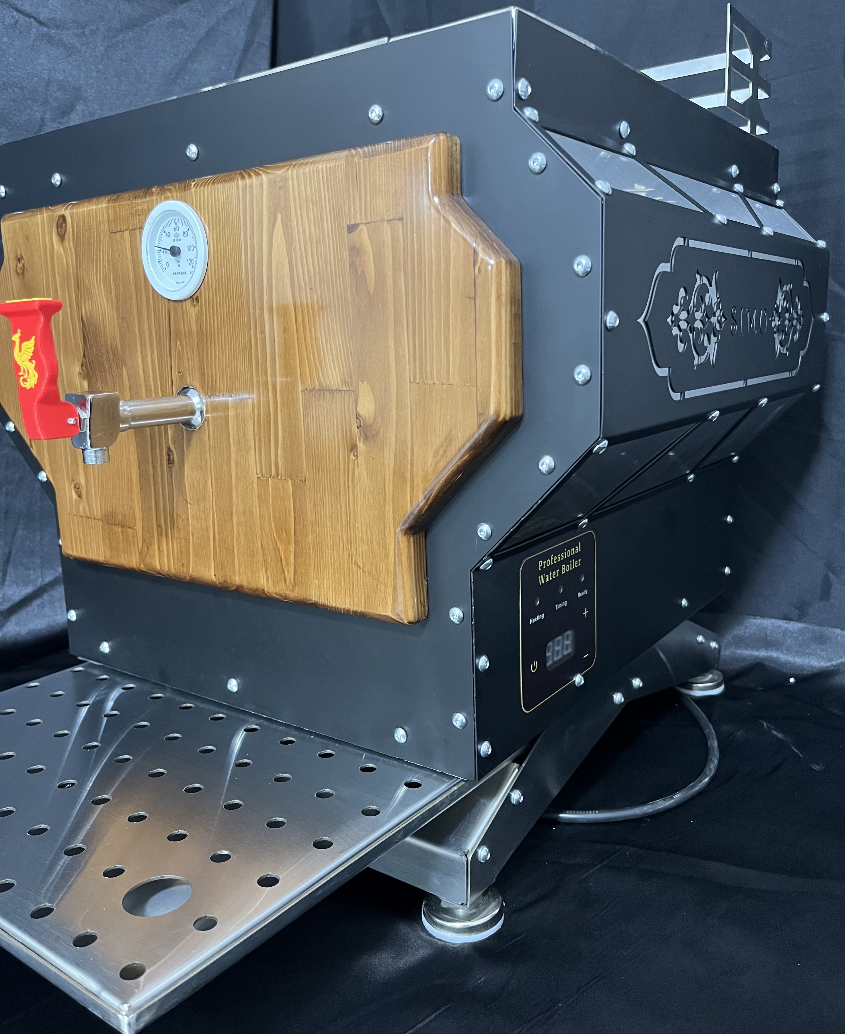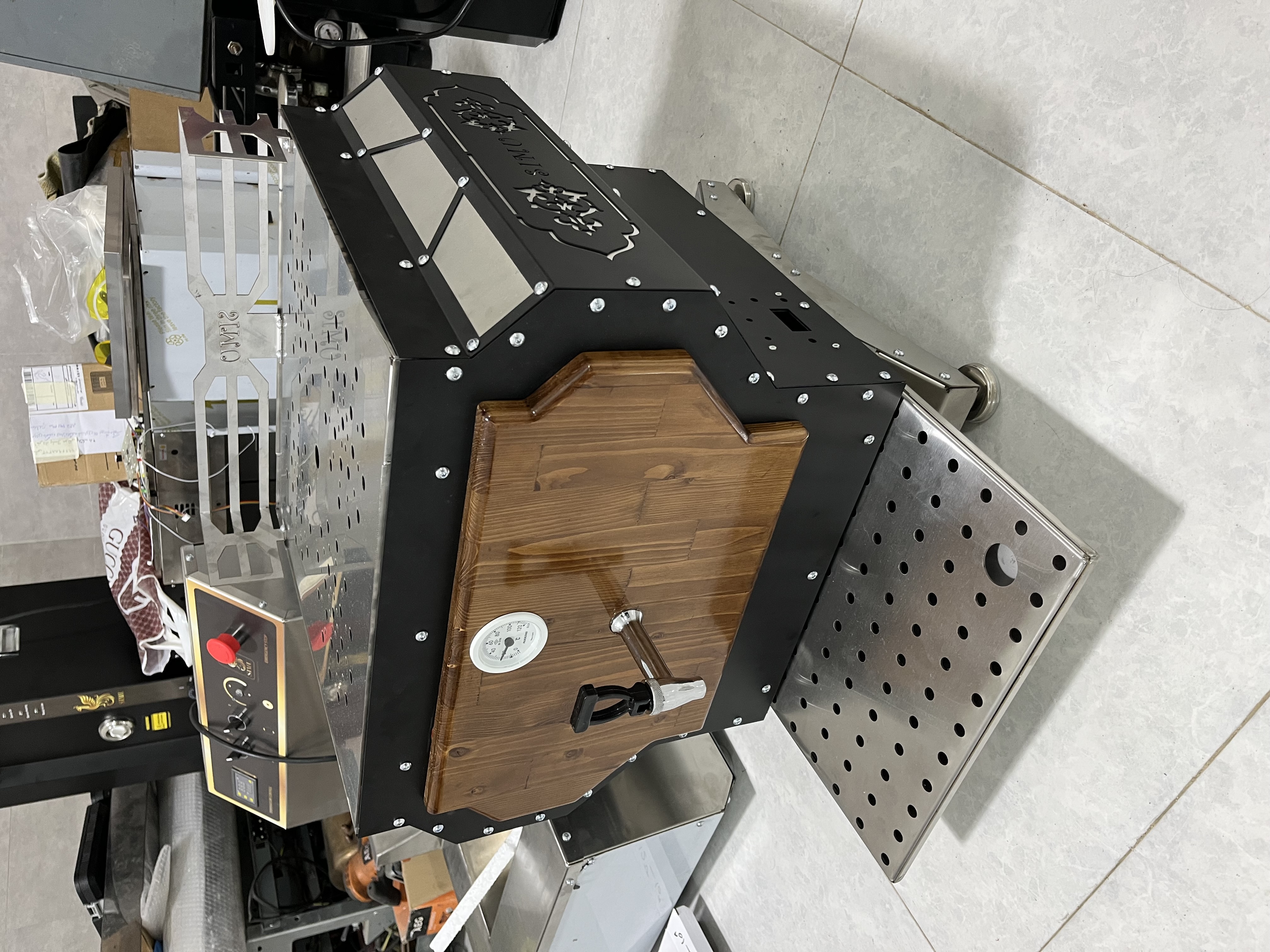 سماور صنعتی تمام استیل وان ۲ میل ۳۰۴ روکش ورق رنگ استاتیک طراحی چوب روسی ظرفیت ۴۰ لیتری سیستم برقی اتوماتیک آبگیری اتوماتیک دارای تصفیه اب کنترل پنل دیجیتال مشابه دستگاه ترکیه ای ساخت ایران